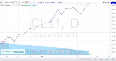 WTI gained 3.6% to $39.86 a barrel Thursday as the US dollar weakened after the Federal Reserve dampenened expectations for interest rate increases. This is in conjunction with major oil producers signaling a growing willingness to freeze output. Brent crude also rose 2.2% to $41.23 a barrel extending previous gains. Both WTI and Brent have recovered more than 40% since plummeting to multi-year lows at the start of 2016. The Wall Street Journal reported, "the gains follow a two-day policy [Read more]