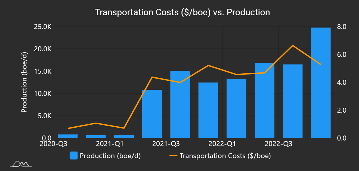 ** Transportation costs are unavailable for MEG Energy in Q4 2022. As such, we have not included their Q3 2022 measure in the median calculation.