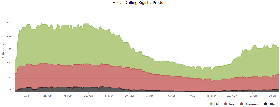 The total number of active rigs in Canada grew week-over-week yet again, reaching 162 today compared to 159 on June 23. The number of active rigs in Alberta increased by 4, a 3.8% increase. BC’s rig count increased for the second consecutive week, reaching 21 active rigs. Saskatchewan’s week end active rig count decreased for the second week in a row, dropping to 31 on June 30 compared to 33 on June 23. The highest active rig count observed this week was 176 on June 26, which was also the highest rig count observed since March.