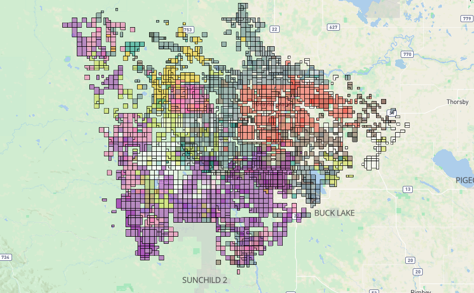 Pembina Cardium Licences Obtained Since January 1, 2022 (Bonterra in brown, Ricochet in red, Whitecap in purple, Obsidian in grey, All Others in black)