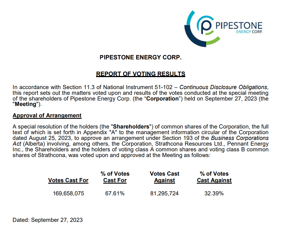 Pipestone Energy Corp. – report of voting results