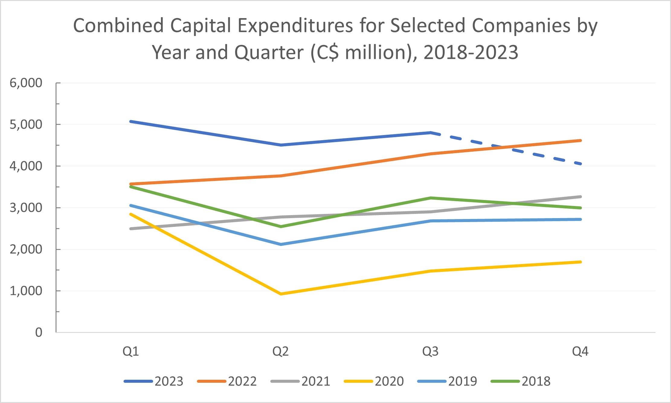| Canadian E&Ps | Q1 2023 | Q2 2023 | Q3 2023 | 2023 Budget | Implied Q4 2023 | % Left |
