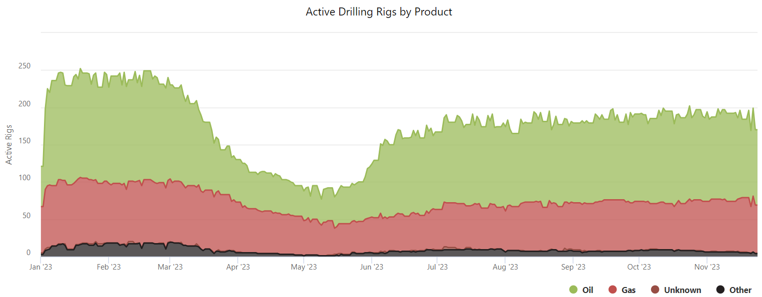 For a closer look at this data, visit our rig count tool with data provided by the CAOEC.