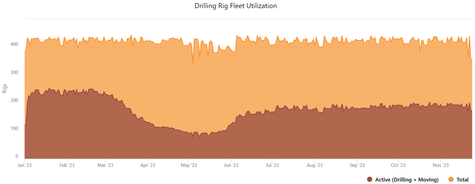 Canada’s active rig count came in at 170 this morning, an decrease of 14 rigs compared to November 17. Alberta’s active rig count decreased from 133 last Friday to 119 today, while Saskatchewan’s rig increased to 25. BC’s active rig count shrunk by 1, settling at 23 rigs today.
