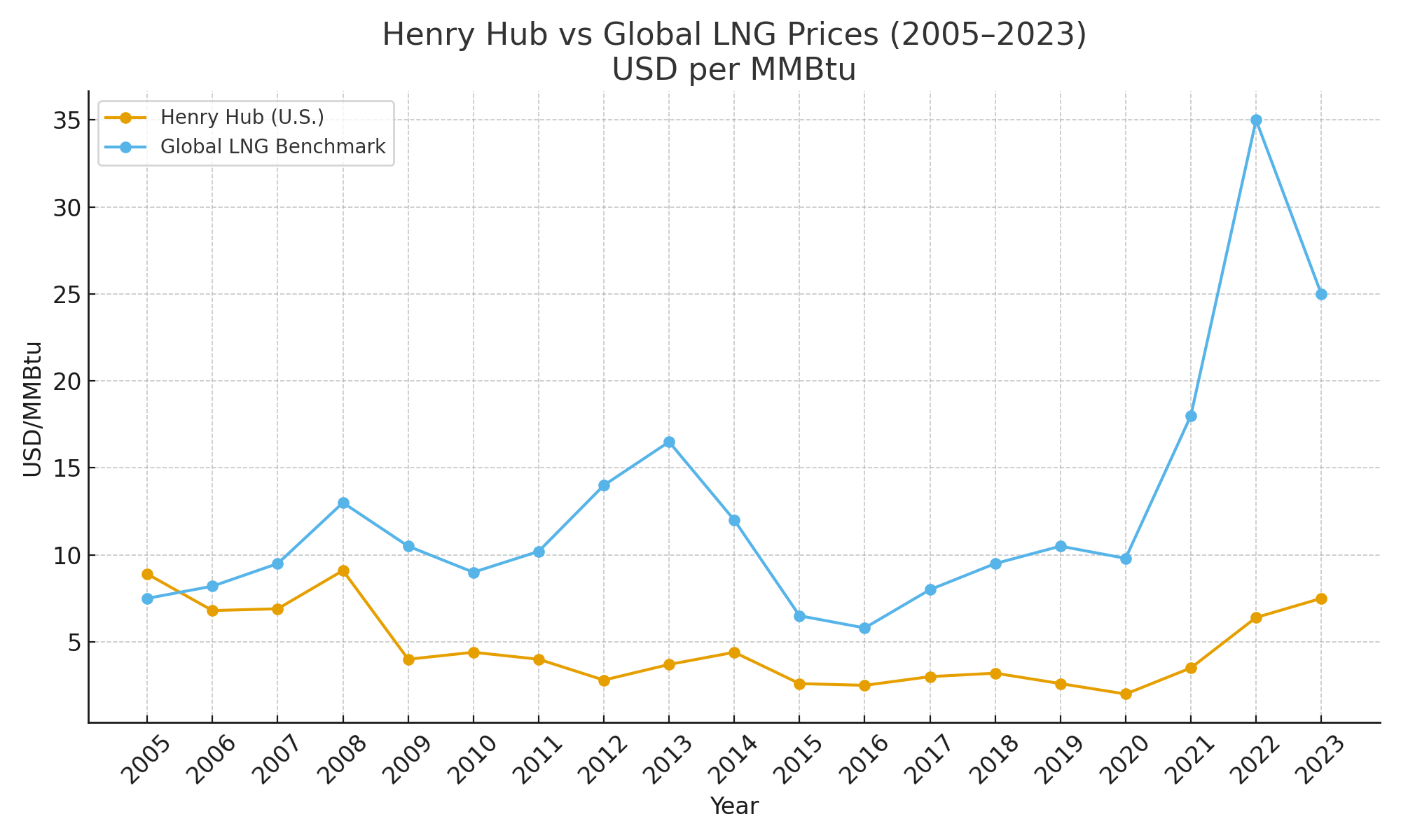 Henry Hub prices averaged barely $2–$3 per MMBtu through much of the 2010s—levels unthinkably low compared with prior decades and dramatically below Europe or Asia. As the chart below shows, the gap between U.S. benchmark prices and global LNG soared after 2010, with U.S. gas often less than a third of the price overseas.