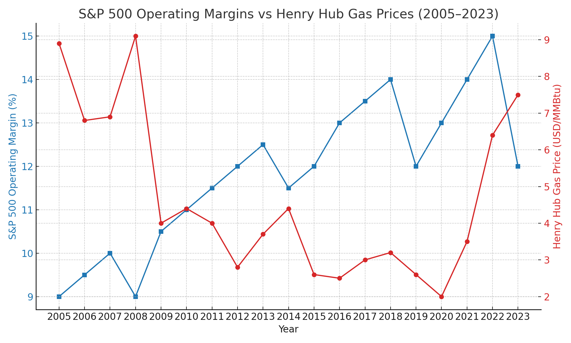 Operating margins across the S&P 500 rose steadily through the 2010s, peaking well above historical norms. Lower energy costs acted as a silent tailwind—keeping inflation in check, freeing up disposable income, and reducing input volatility.